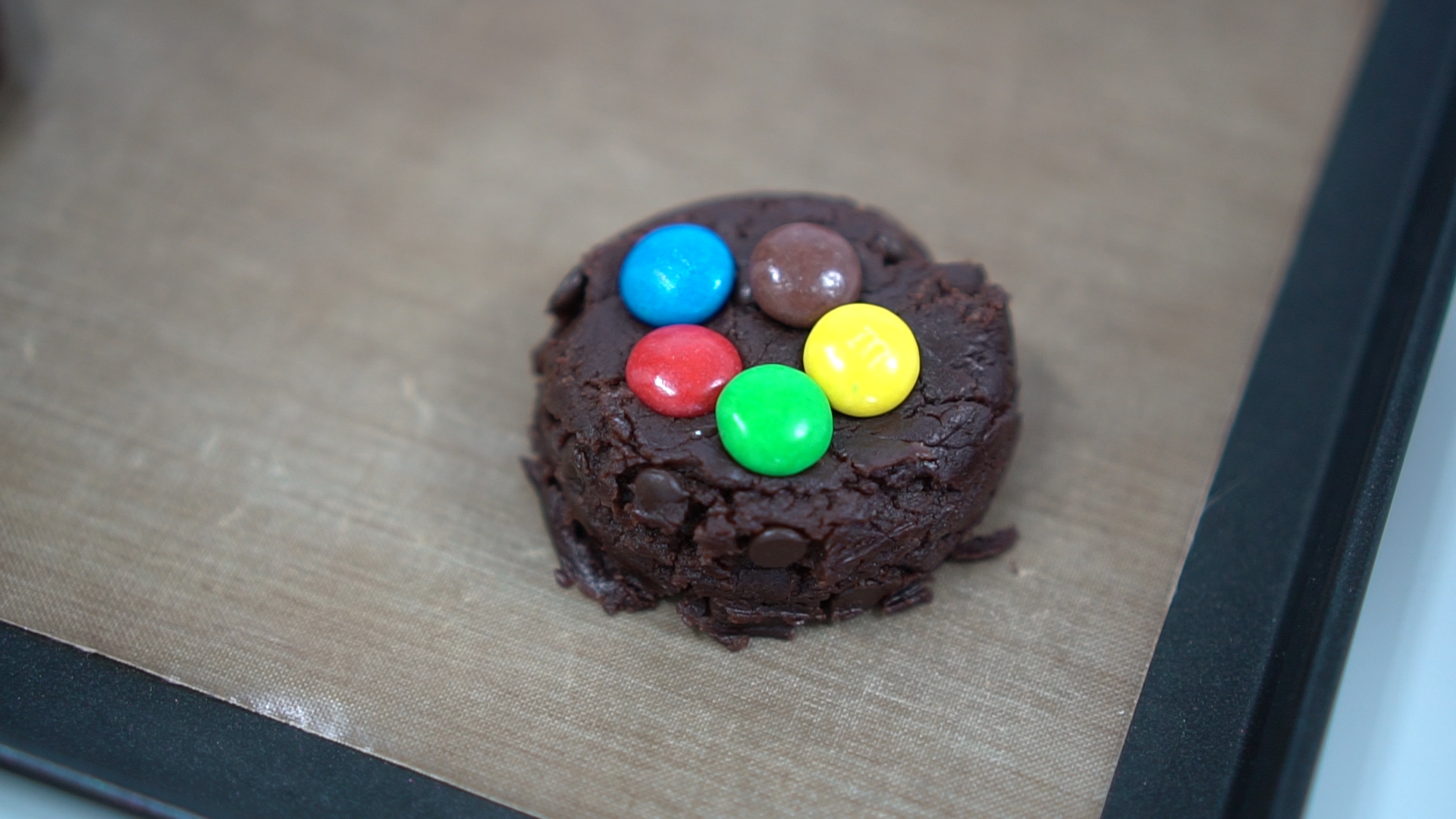 반죽을 손을 살짝 누른 후, m&m 초콜릿으로 장식해주세요