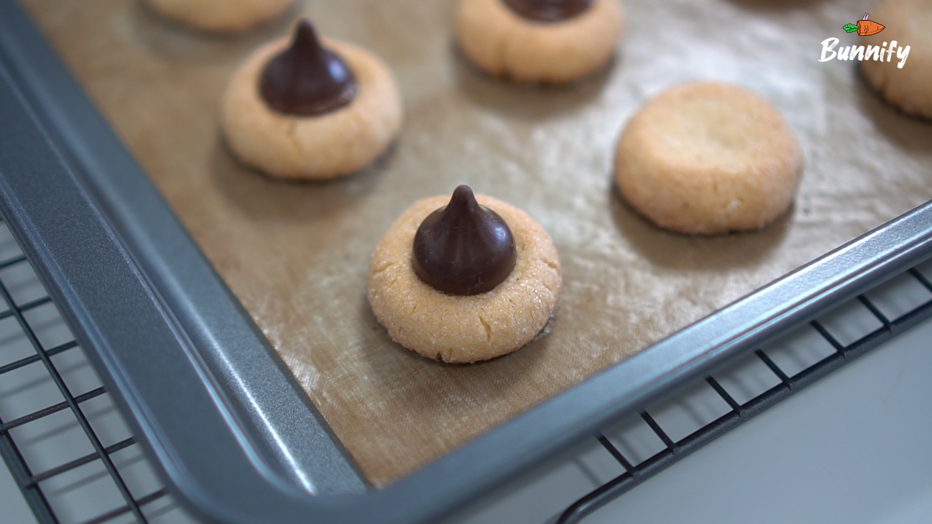 구워져 나온 쿠키가 너무 뜨겁지 않은 상태(한 김 식었을 때) 키세스를 살짝 눌러 올려 주세요~
