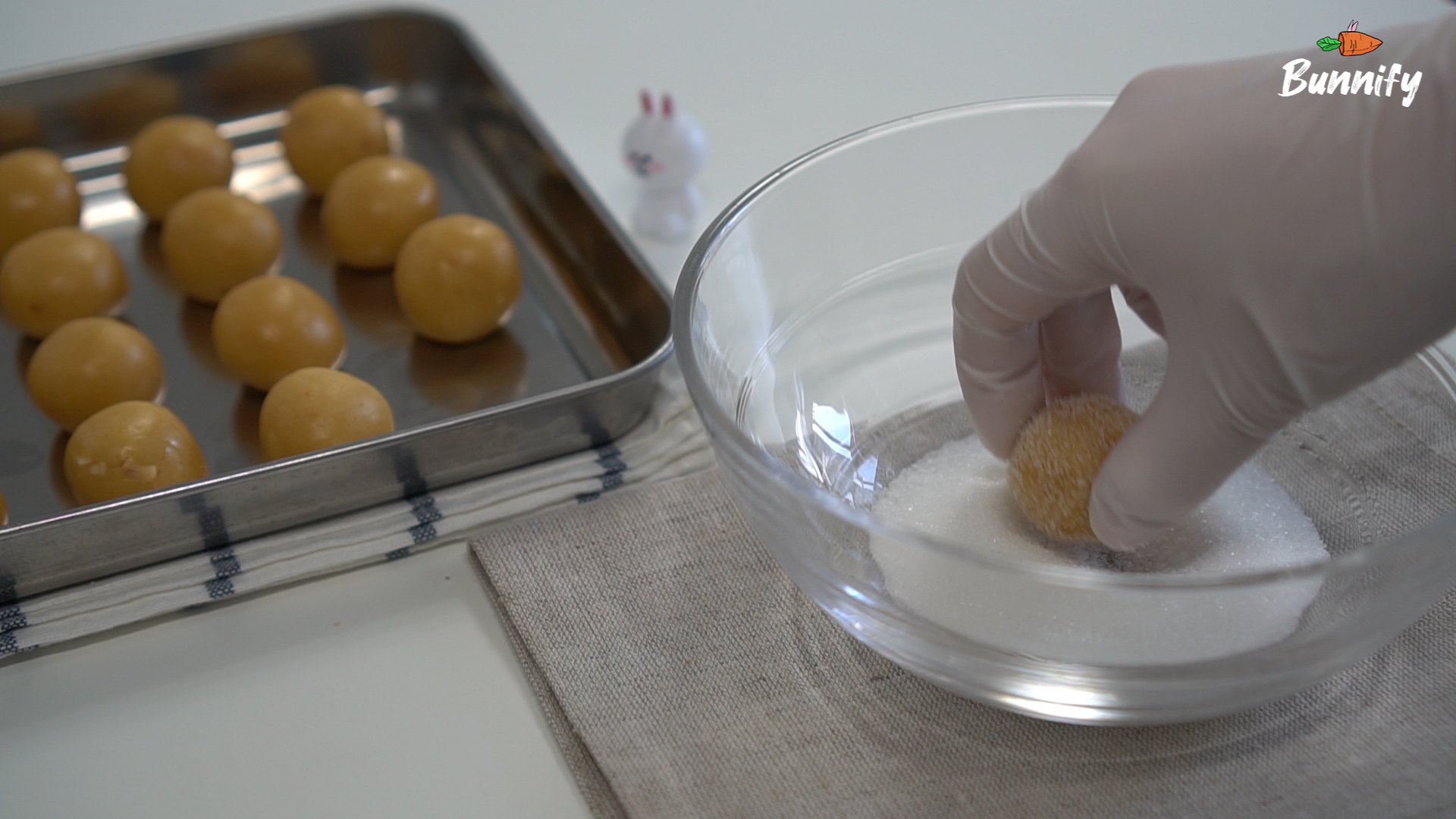 7. Divide the dough into small pieces(15g) and roll in granulated sugar