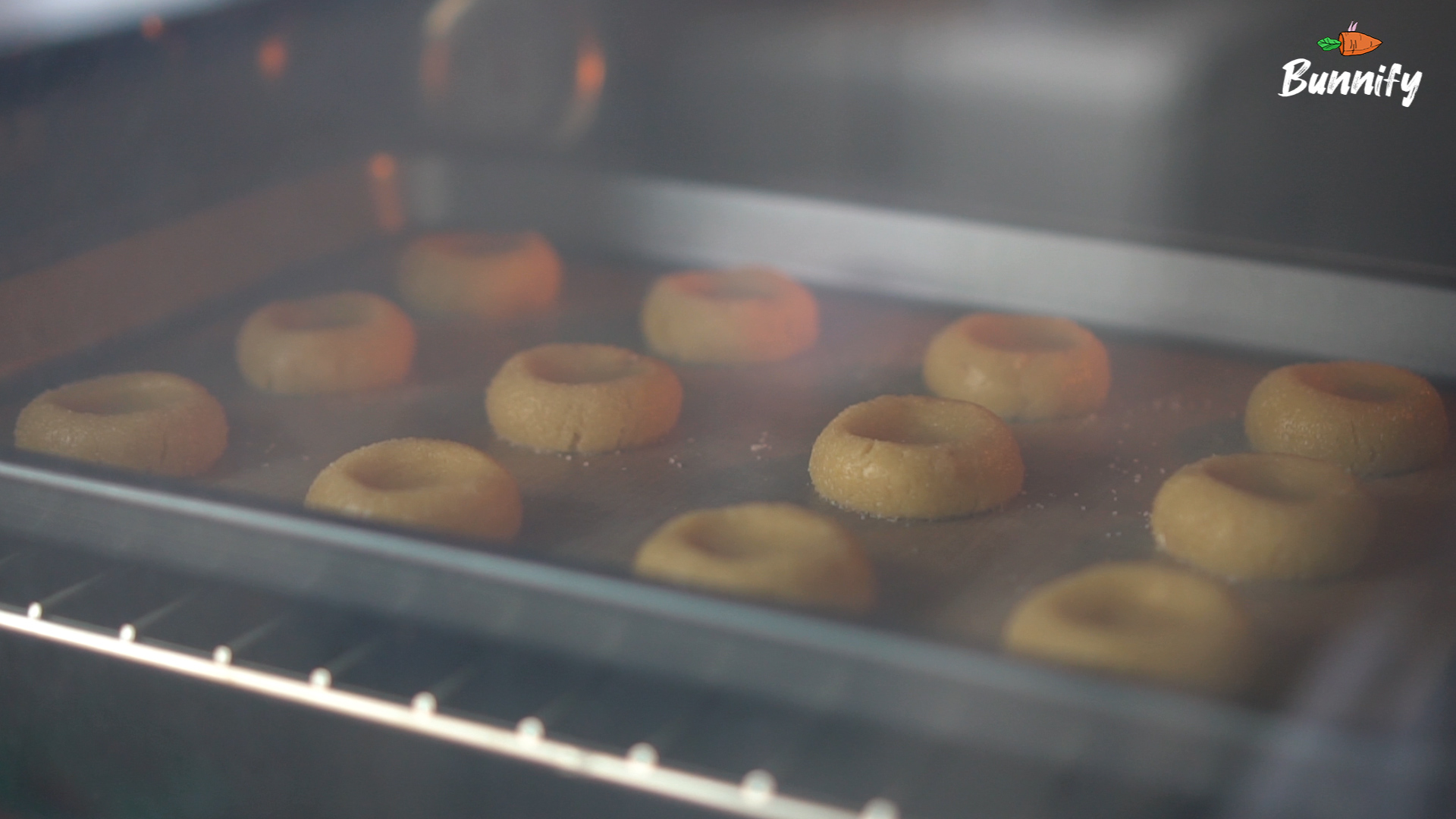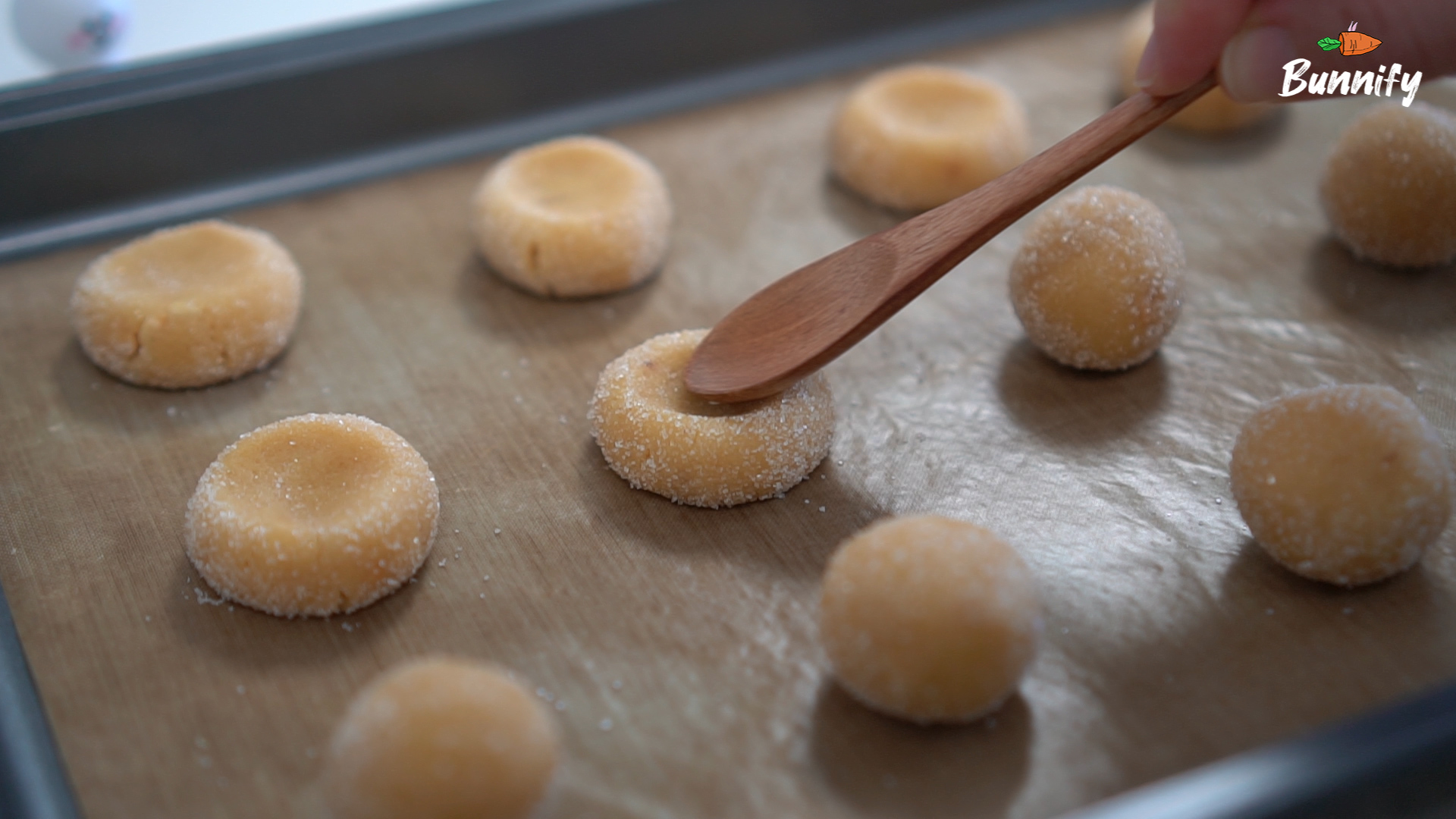8. Place on prepared baking sheets and make indentation in centre of each cookie using a spoon