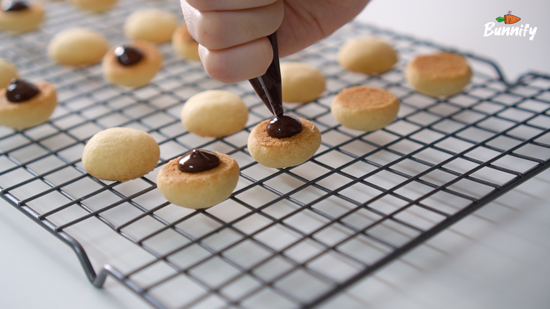 구워져 나온 쿠키를 식히는 동안, 초콜릿을 중탕으로 또는 전자레인지에서 녹여 주세요. 녹인 초콜릿을 짜기에 적절한 되기가 되도록 식혀 주세요.