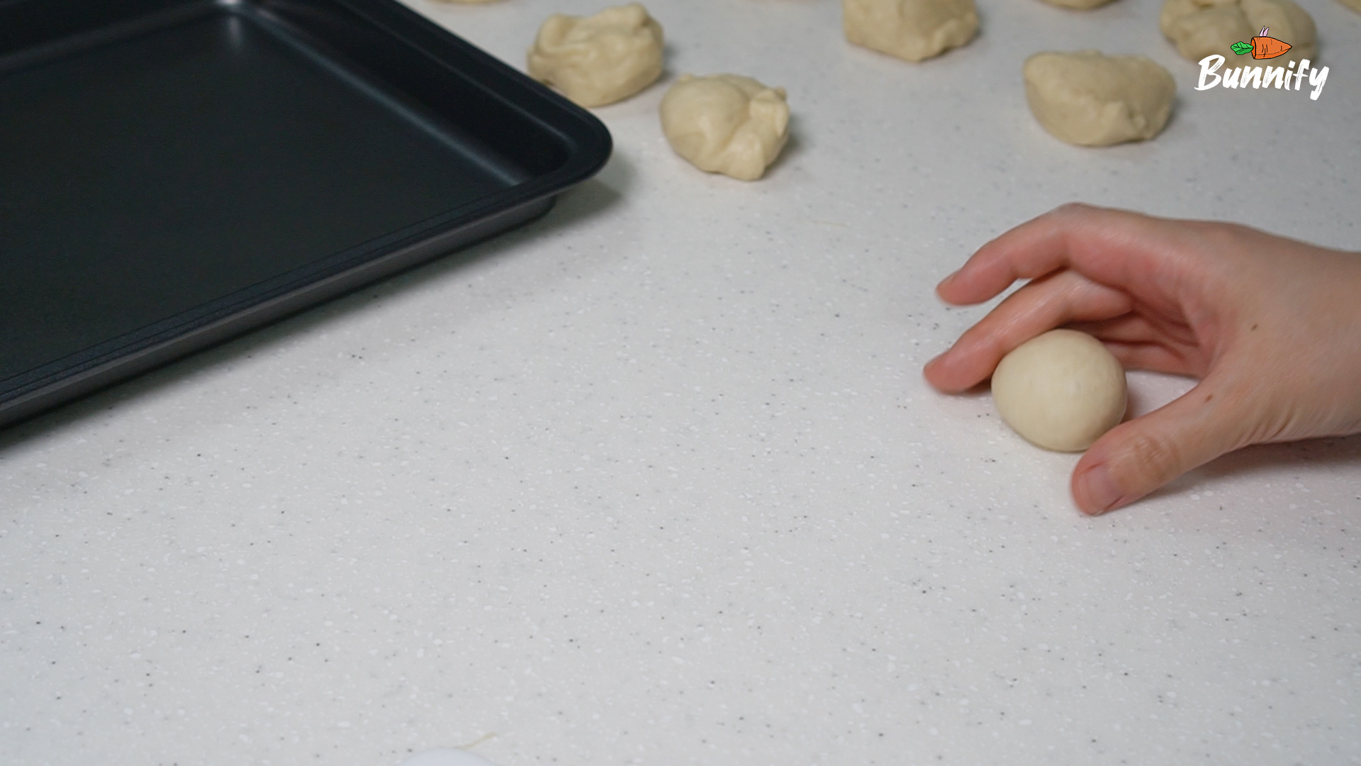 6. 볼에서 반죽을 꺼내 작업대로 옮겨 주세요. 살짝 눌러 가스를 뺀 뒤, 16등분해 주세요. 분할한 반죽을 둥글리기 해주세요.