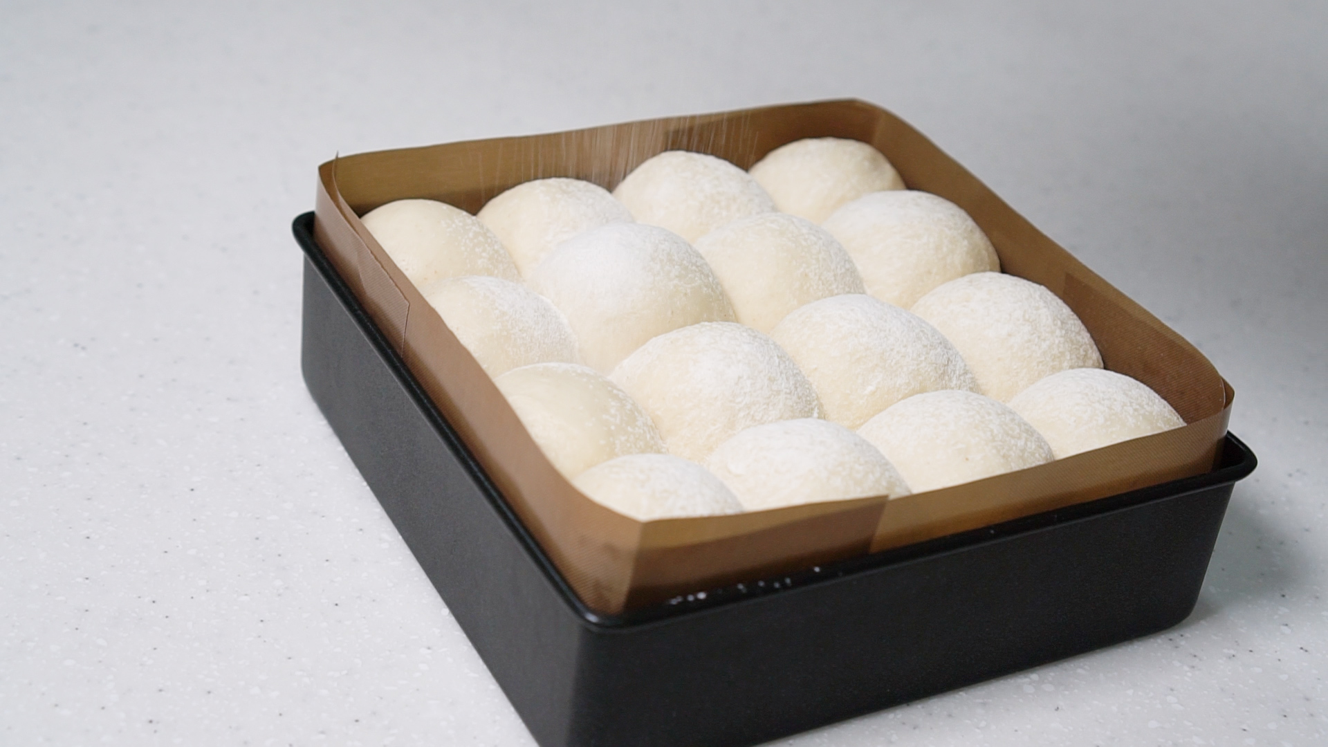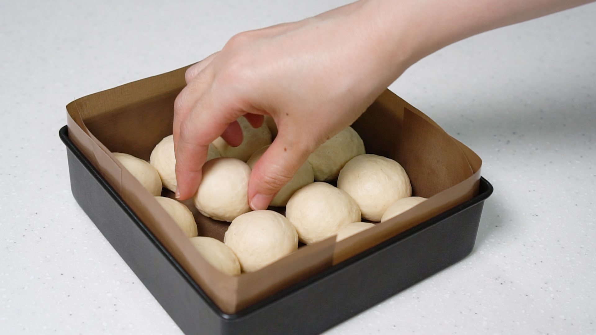 8. 둥글리기 한 후 정사각형 팬에 넣어 주세요