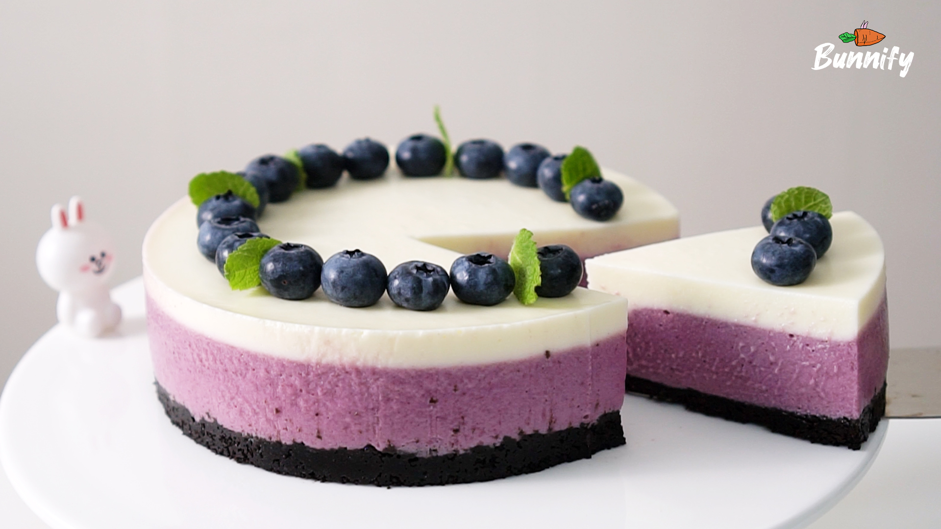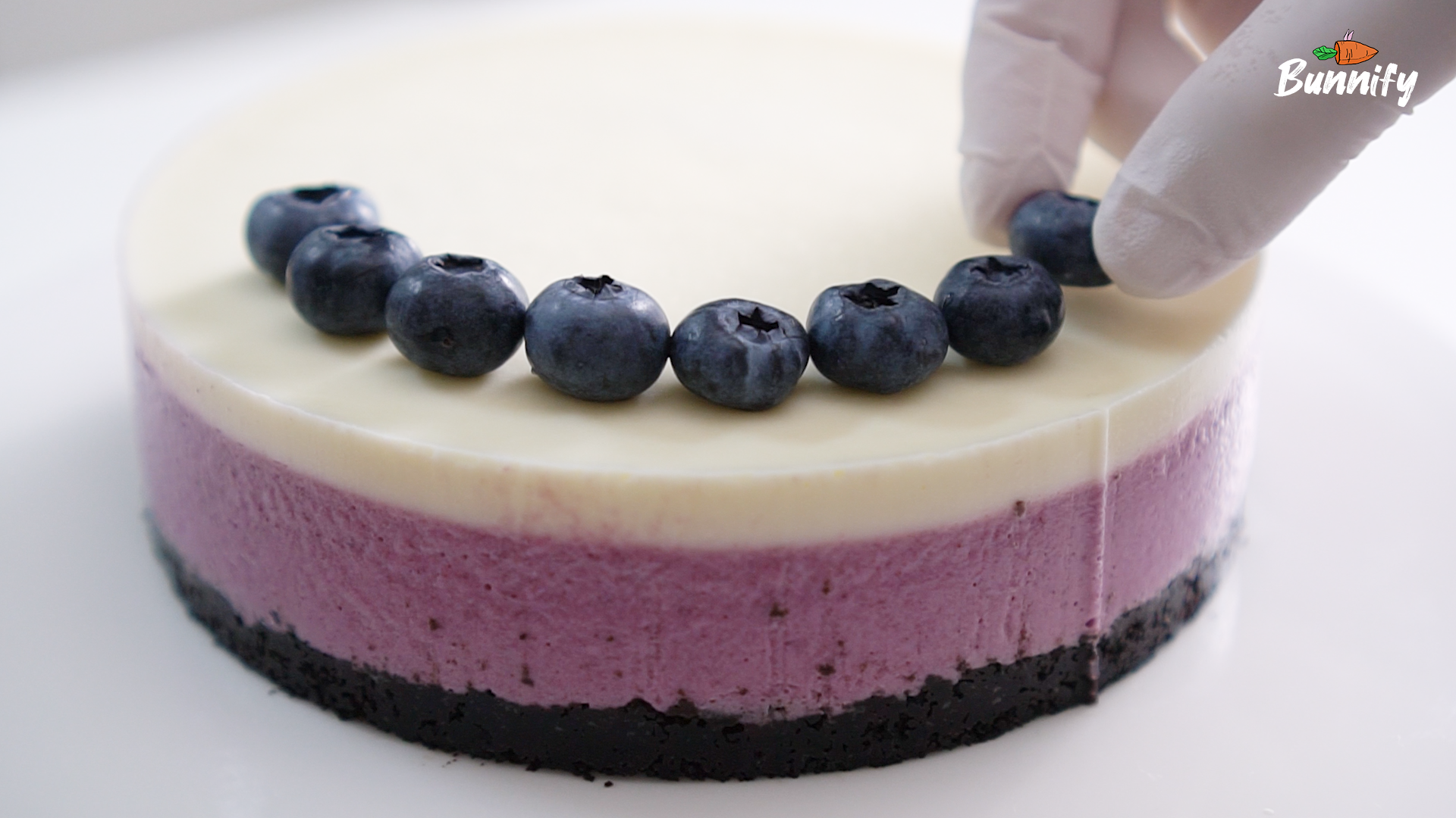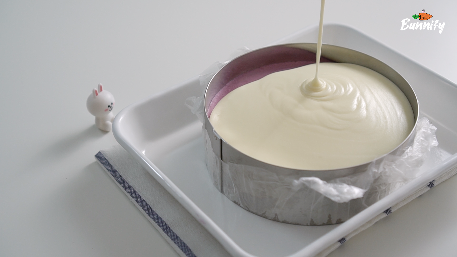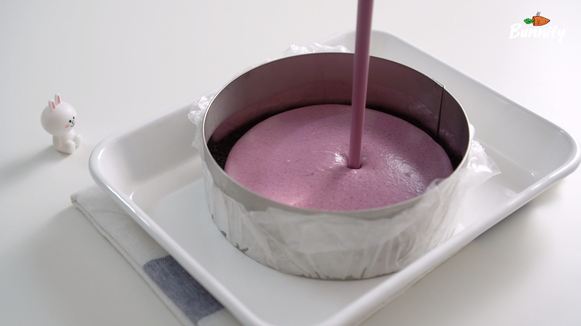 8. 블루베리 무스 층 위에 남은 크림치즈 무스를 부어 주세요