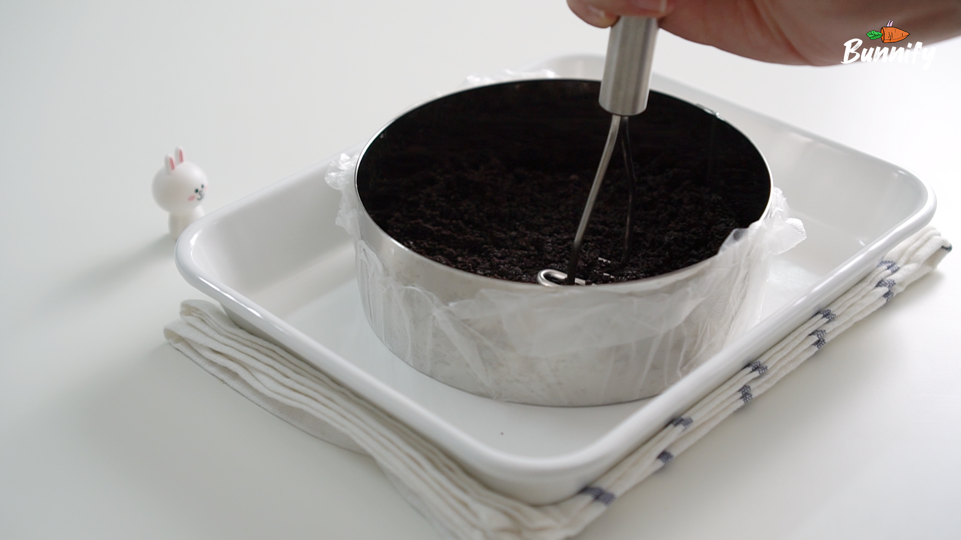 2. 랩을 깐 무스틀에 넣고 단단하게 눌러 주세요