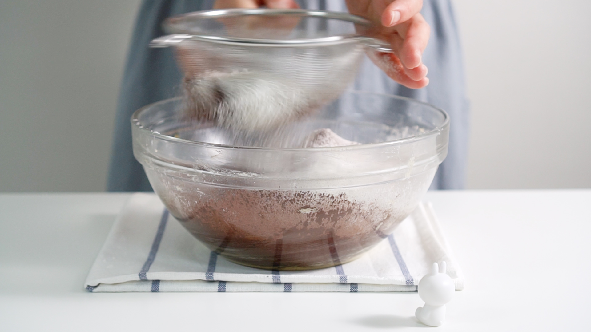3. 중력분, 코코아 파우더, 베이킹 파우더, 소금을 체 쳐서 넣어 주세요